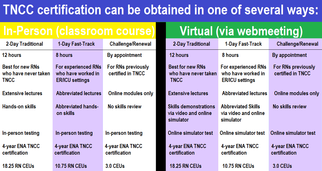 Trauma nursing as a discipline refers to the process and content of all the different roles nurses have in the care of the trauma patient. Knowledge is the core of any discipline. The purpose of TNCC is to present core-level knowledge, refine skills, and build a firm foundation in trauma nursing. ENA developed and implemented the TNCC for national and international dissemination as a means of identifying a standardized body of trauma nursing knowledge. The TNCC (Provider) is a 16-hour course designed to provide the learner with cognitive knowledge and psychomotor skills.